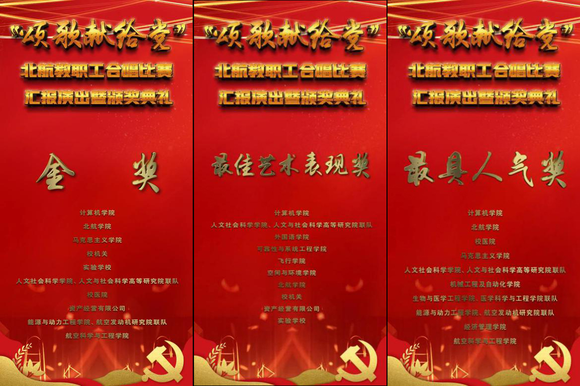 2021年6月26日晚19点,由校工会主办的“北航教职工‘颂歌献给党’合唱比赛汇报演出暨颁奖典礼”在北航晨兴音乐厅隆重举行,w66利来旗舰厅、人文与社会科学高等研究院联队获得了最高荣誉“金奖”,以及“最佳艺术表现奖”和“最具人气奖”共三项大奖。