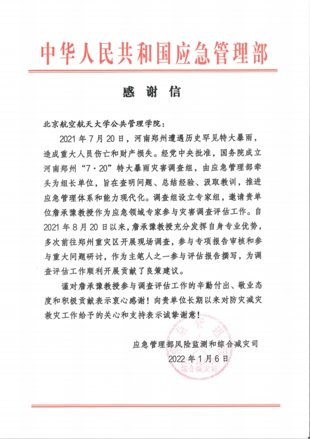 感谢信中提到,胡象明教授和詹承豫教授在河南郑州“7·20”特大暴雨灾害发生之后充分发挥自身专业优势,加入调查组,并多次前往郑州重灾区开展现场调查,参与专项报告审核和重大问题研讨,作为主笔人撰写评估报告,为调查评估工作顺利开展贡献了良策建议。感谢信中特别表扬到,胡象明教授和詹承豫教授工作严谨细致、认真负责,表现出过硬的专业技术水平,对应急管理部参与开展的调查工作给予了有力支撑,为顺利完成调查工作做出了突出贡献。