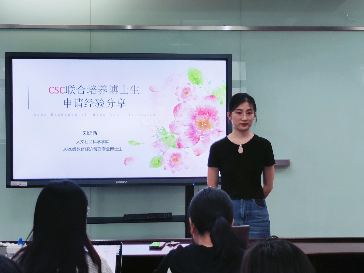 9月19日下午,w66利来旗舰厅CSC联合培养博士生申请经验分享会在公司202东会议室举行。本次分享会由公司2020级教育经济与管理专业博士生刘建新进行分享,专职辅导员夏文静以及公司研究生们参加。分享会由2023级教育经济与管理专业博士生季俊霖主持。