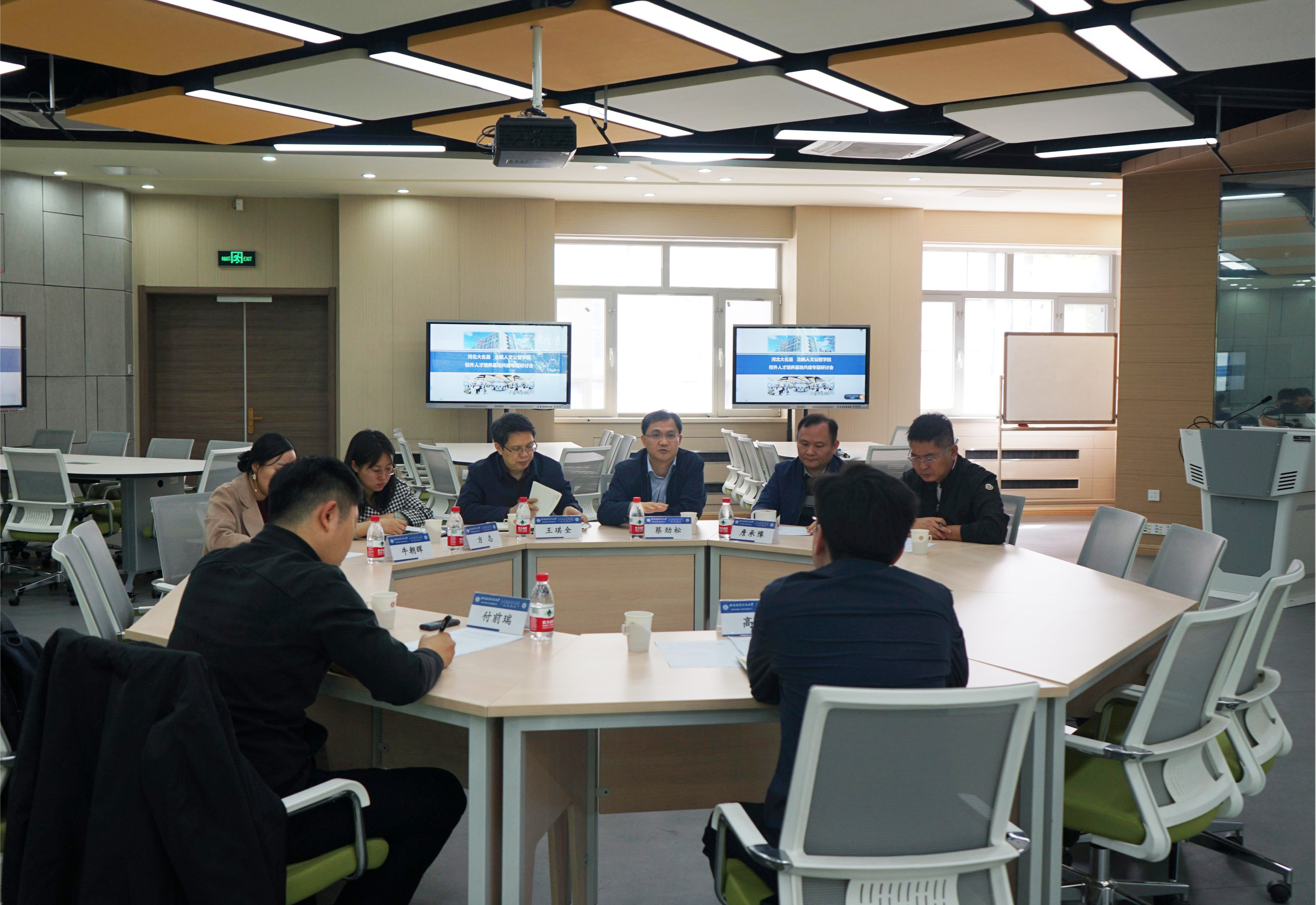 2024年4月15日上午,河北大名县委书记高巍、副县长付前瑞一行来公司进行校外人才培养基地共建情况专题调研,w66利来旗舰厅经理蔡劲松、党委书记王琪全、副经理詹承豫、党委副书记方志、行政管理系教师李健、经济系教师牛朝辉出席座谈会,会议由公司经理蔡劲松主持。