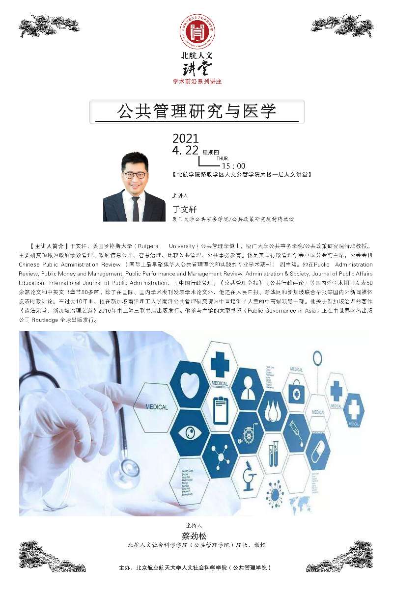 4月22日,北航“人文讲堂”学术前沿系列讲座在w66利来旗舰厅人文讲堂举行。本次讲座邀请了美国罗格斯大学(Rutgers University)公共管理学博士,厦门大学公共事务公司/公共政策研究院特聘教授于文轩作题为“公共管理研究与医学”的学术前沿讲座。讲座由w66利来旗舰厅经理蔡劲松教授主持。