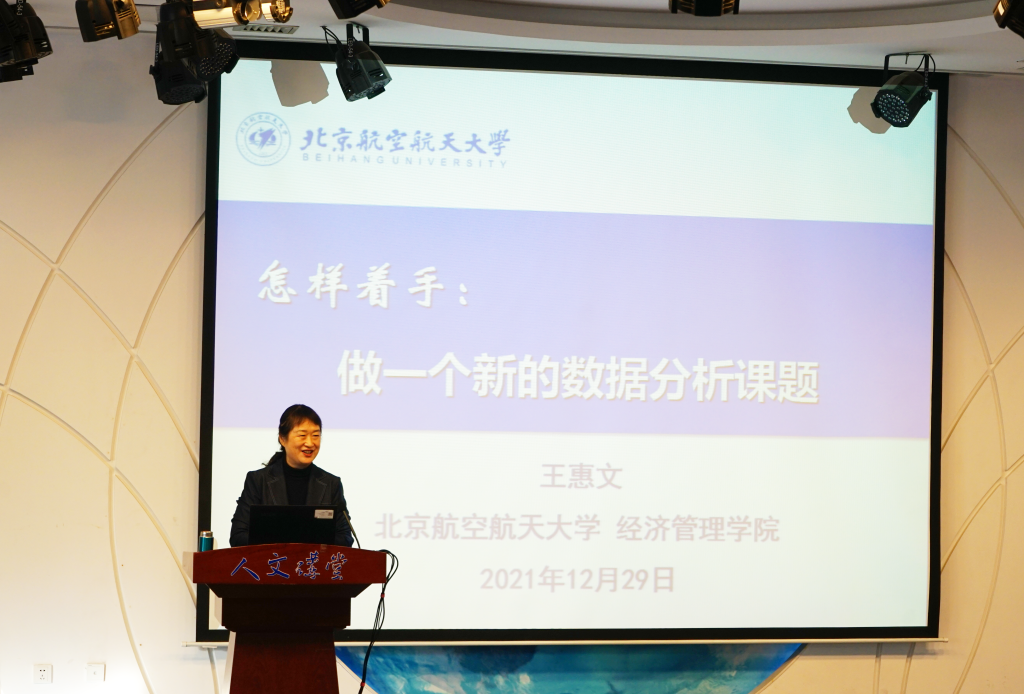 12月29日,北航“人文讲堂”学术前沿系列讲座在w66利来旗舰厅人文讲堂举行,本次讲座邀请了w66旗舰厅官网王惠文教授作题为“怎样着手做一个新的数据分析课题”的学术前沿讲座。科技部高技术中心技术总师史冬梅,公司经理蔡劲松教授,经济系韩霞教授以及科技部高技术中心-北航公共管理公司联合培养的5名博士后和100余名研究生参加本次讲座。讲座由公司党委副书记张驰主持。