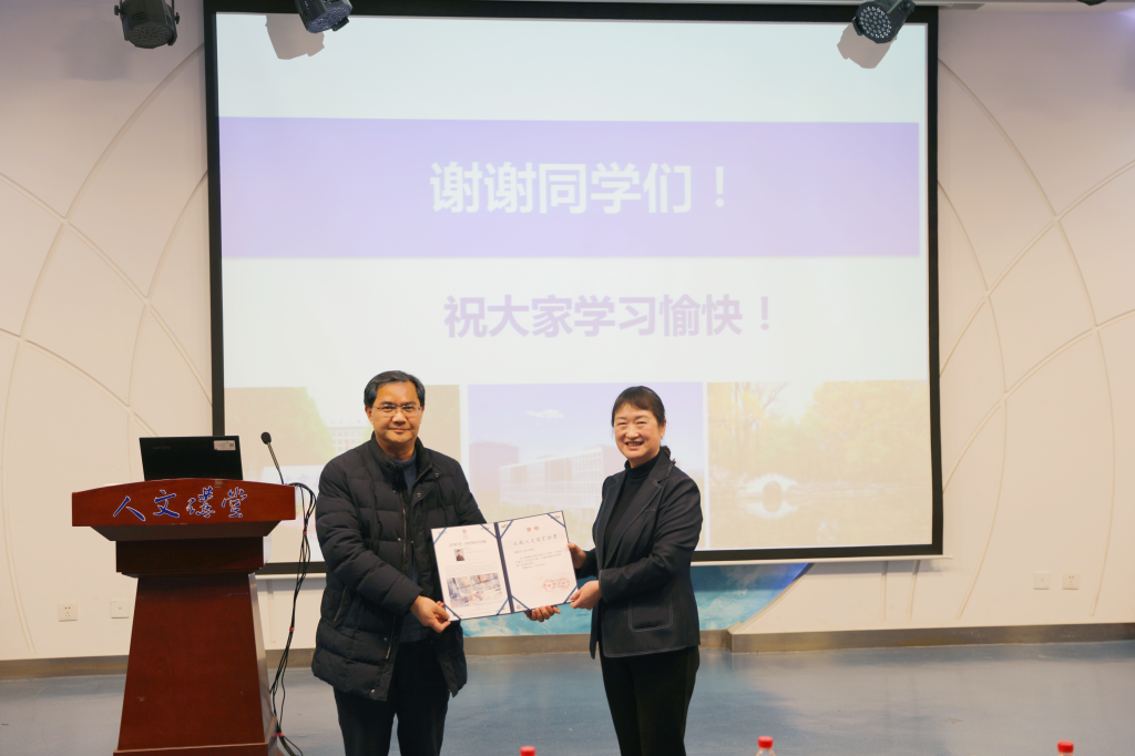 w66利来旗舰厅经理蔡劲松教授代表公司向王惠文教授颁发“人文讲堂”纪念证书并合影留念。