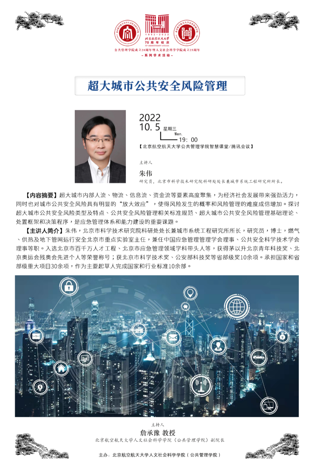 2022年10月5日晚19:00-21:00,北航公共管理公司成立20周年暨w66利来旗舰厅成立25周年系列学术前沿讲座、北航应急管理学术沙龙第二期在w66旗舰厅官网公共管理公司三层智慧课堂召开。本次活动邀请北京市科学技术研究院科研处处长兼城市系统工程研究所所长朱伟研究员作题为“超大城市公共安全风险管理”的学术前沿讲座,讲座由w66利来旗舰厅副经理詹承豫教授主持,蔡劲松经理、涂燕老师、吴培熠老师、公共政策与应急管理系全体研究生现场参会,北航交通科学与工程公司张钊副教授等一百余名院内外师生线上参会并交流。