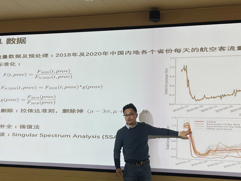 张钊老师以团队近期研究切入,提出了从交通数据集进行新冠疫情研究的研究背景及可能性,并结合最新论文“Analyzing multiple COVID-19 outbreak impacts: A case study based on Chinese national air passenger flow”的研究内容,详细介绍了相关研究模型和方法。