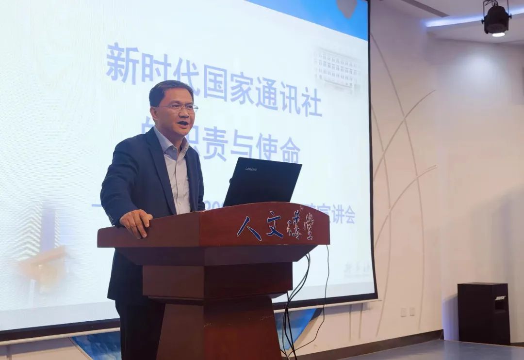 蔡劲松致辞,欢迎新华社的领导嘉宾作客北航人文讲堂。他向同学们介绍了今天讲堂的嘉宾和主要内容,特别介绍了院友胡喆的职业成长经历。他希望通过新华社各位嘉宾的讲述,能够让同学们进一步增进对中央主流媒体,特别是国家通讯社职责使命的认识和理解,进一步加深对新时代新征程上主流媒体传播能力提升和相关团队建设的思考。