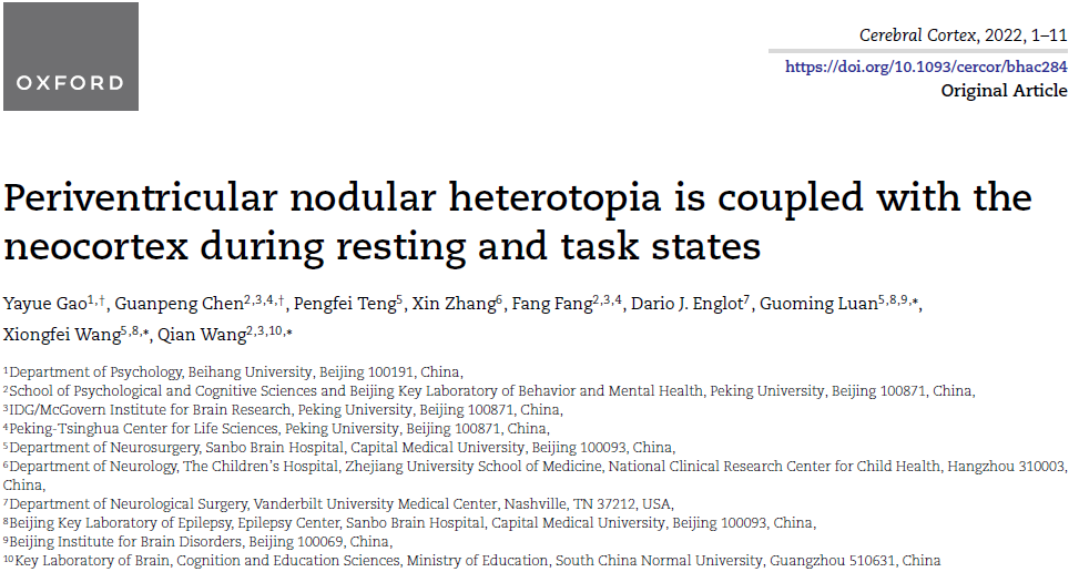 近日,公司高雅玥助理教授在期刊《CEREBRAL CORTEX》(影响因子4.86,中科院一区Top期刊)合作发表题为Periventricular nodular heterotopia is coupled with the neocortex during resting and task states的学术论文(https://doi.org/10.1093/cercor/bhac284)。本篇论文揭示了异位的灰质组织与正常皮层功能连接的时空特性,并提出了神经元迁移异常后共同发育的假说。