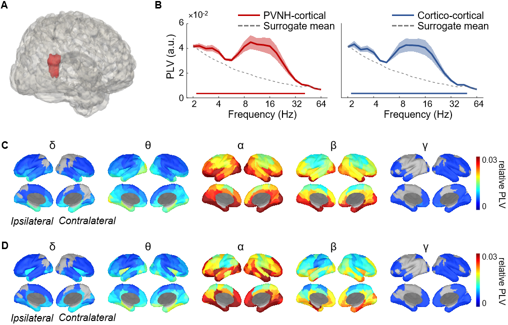 为了对这一问题进行进一步探究,高雅玥助理教授和其他相关研究者利用脑磁图记录静息和任务状态下的灰质异位患者大脑影像,并计算异位的灰质与正常皮层的相位耦合度。研究发现,异位灰质和正常皮层的功能连接主要体现在α-β频段,与健康人群大脑皮层连接的频谱特征一致(图2B)。此外,无论是在频谱维度(图2B)还是空间维度(图2C-D),异位灰质与皮层的连接模式都与皮层内部的连接模式非常相似。研究者发现,异位的灰质组织仍然保留了一定的认知功能,并可以参与到正常皮层的功能网络中。