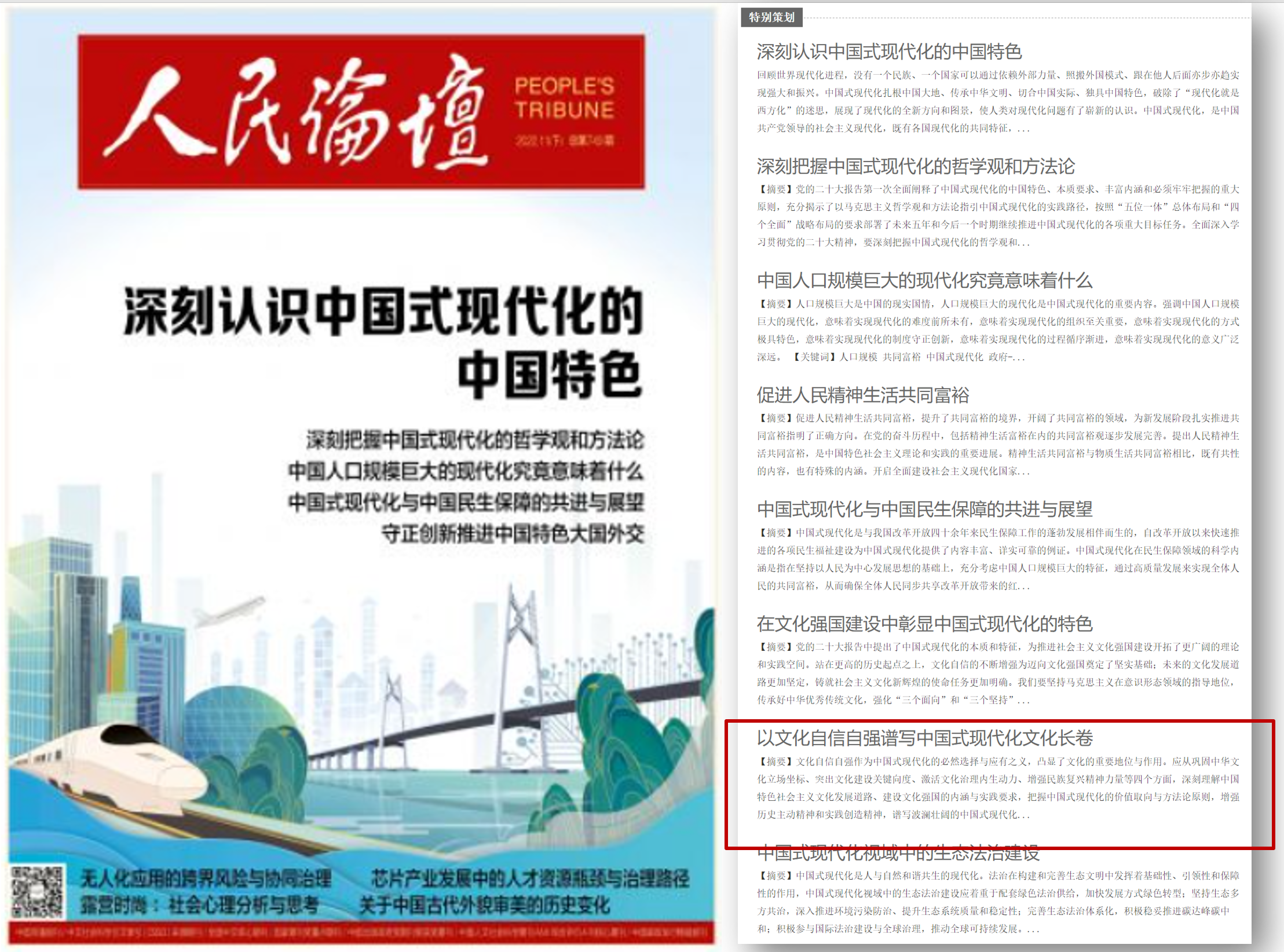 编者按:公司经理蔡劲松教授撰写的阐释党的二十大精神文章《以文化自信自强谱写中国式现代化文化长卷》,刊发于人民日报社《人民论坛》杂志2022年第11月下期“特别企划”栏目,全文如下。