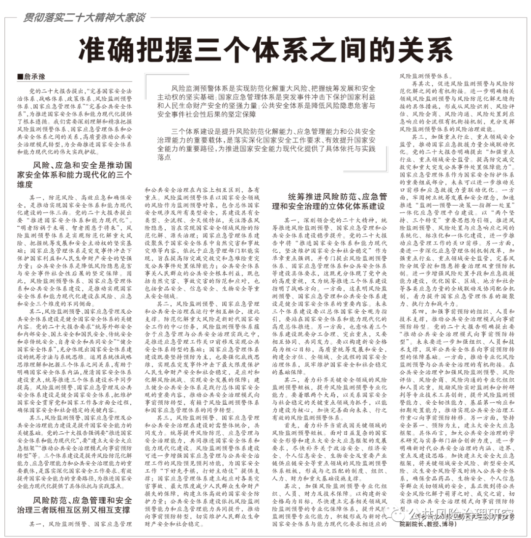 近日,w66旗舰厅官网公共管理公司副经理詹承豫教授接受《中国应急管理报》邀请,就贯彻落实党的二十大报告,理解和把握风险监测预警体系、国家应急管理体系和公共安全治理体系之间的逻辑关系做出阐释,发表《准确把握三个体系之间的关系》,以下为文章全文。