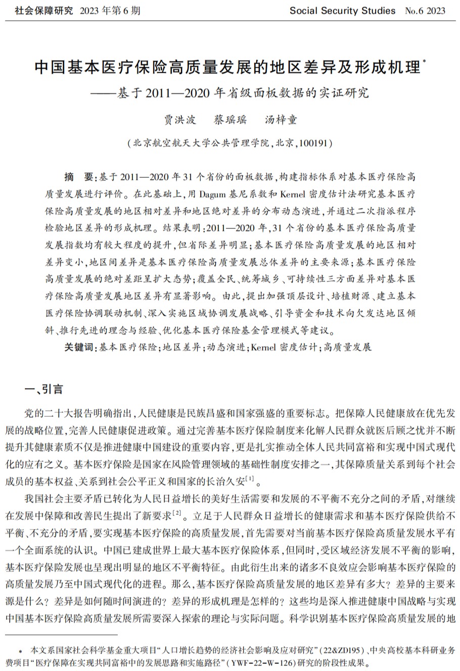 近日,公司教授贾洪波、博士研究生蔡瑶瑶、研究生汤梓童在《社会保障研究》2023年第6期发表题为《中国基本医疗保险高质量发展的地区差异及形成机理--基于2011-2020年省级面板数据的实证研究》的论文,以下为文章全文。