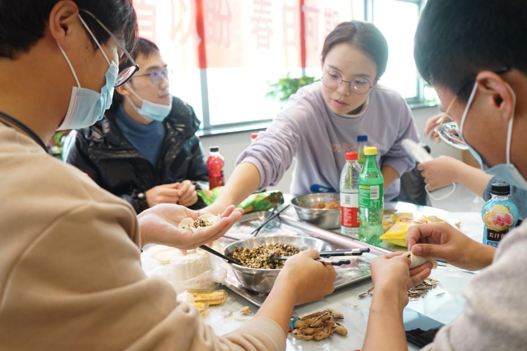 晨曦破雾,温暖北航。同学们圆桌围坐、畅聊谈心,分享包饺子的技巧和家乡的味道。研究生廖珅感叹:“‘热炕头’上看春晚,亲手包饺子,是家的味道!”在包饺子速度赛、蒙眼睛包饺子赛和饺子创意拼图赛中,大家同心协力、各出奇招,由饺子拼成的“我爱人文”“年年有余”等创意拼图无不显示着人文学子对公司的祝福和对2022的期待。“和面”“擀皮”包饺子,同学们适度调适学业压力,增进同学友谊,增强班级凝聚力、向心力,提升校园归属感,充分感受劳动光荣的劳动文化氛围。过程中,人文学子同样展示了一场集跳舞、弹唱、乐器、相声、合唱各节目为一体的视听盛宴。