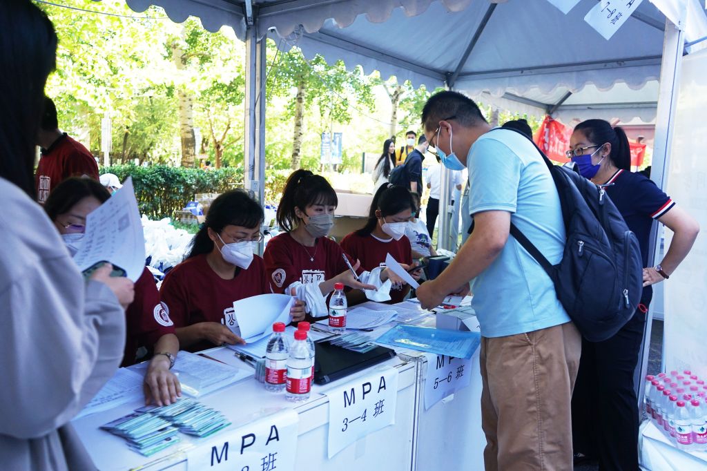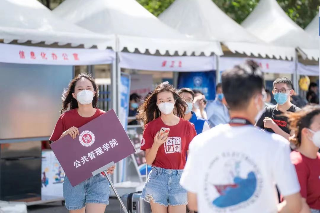 员工们通过人脸识别、测体温、出示录取通知书与“校园通行卡”绿码等程序,有序进入校园。在迎新志愿者的引导下完成注册报到,并领取新生大礼包。