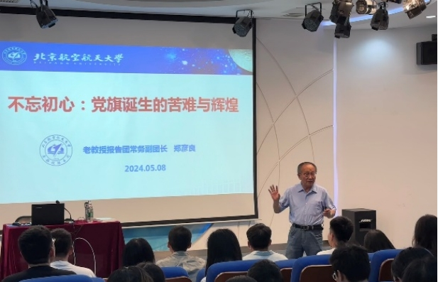 5月8日,w66利来旗舰厅铸魂育人系列专题党课2024年第3期在人文讲堂举行。中国老教授协会常务理事、北航老教授报告团常务副团长郑彦良教授作题为“不忘初心——党旗诞生的苦难与辉煌”专题党课,人文公管公司党委副书记方志主持,公司师生党员和入党积极分子参加学习。